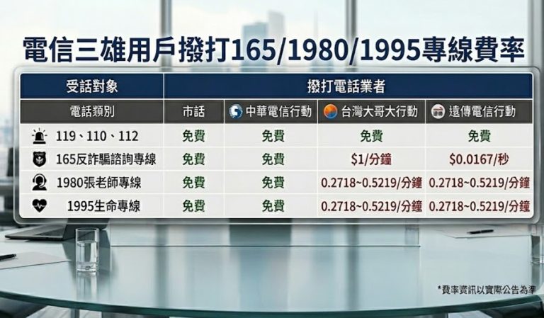 日前有民眾向立委陳情,質疑撥打165防詐專線諮詢居然要收費! 經林俊憲委員查詢後,發現無論是165專線、1980張老師專線或1995生命專線,不同電信業者撥打還要負擔通話費。林立委認為,這些是重要公共服務,不該因為使用哪一家電信業者而有差別待遇,故要求相關單位應編列預算,讓全民都能免費使用。 打165專線、張老師1980、生命線1995生命專線如何收費? 三大電信目前特殊簡碼收費標準為何呢? 以下 […]…