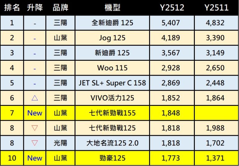 2025年12月機車掛牌量出爐,整體機車總掛牌數為63,550 輛,較上月大幅成長17% 。在最後一季貨物稅補貼優惠下,雖電動機車大幅衰退下,2025年年度總掛牌量為708,406輛,保住70萬年度掛牌門檻。 2025年12月份與2025年年度台灣機車熱銷榜為何呢? 以下作一整理與說明:…