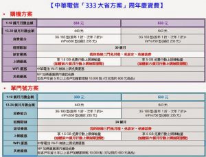 中華電信為歡慶 2013 周年慶,祭出「333 大省方案」周年慶資費方案. 自 7/1 起至 9/30申辦該資費方案,主打語音月租首年1折起,申辦語音183型搭配mPro550型上網資費,首年月繳333元、次年月繳443元,每月1.5G上網傳輸量;辦語音183型搭配mPro750型上網資費,首年月繳533元、次年月繳643元,享5G上 網傳輸量。單辦門號綁約24個月, 購機則綁約30 […]…
