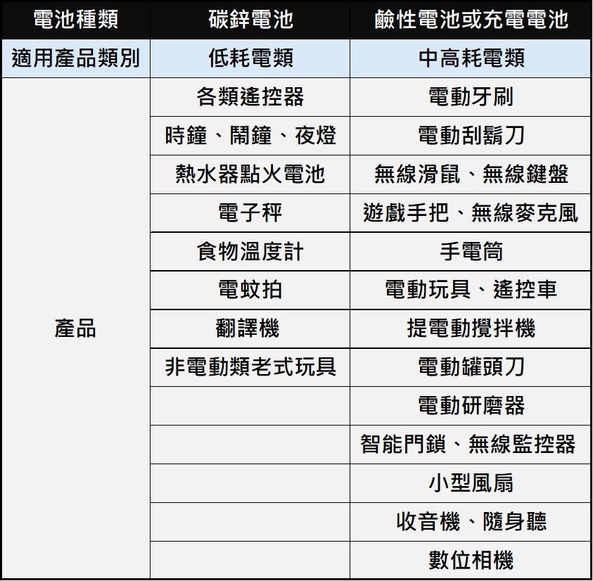 長時間開機、低耗電的電器(如時鐘、遙控器、熱水器、電蚊拍..等)請使用碳鋅電池,尤其是使用鹼性電池會出現危險性的熱水器; 若是中高耗電類且必須持續性使用的電器,如手電筒、電動牙刷、手電筒、收音機…等等 ,則選擇鹼性電池或是使用可充電的充電電池