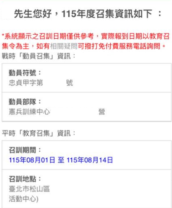 若被列入115教召對象,系統將會提供115年教召資訊,包含揭露「動員符號」、「動員部隊」、「動員符號」、「調召期間」、「調召地點」。