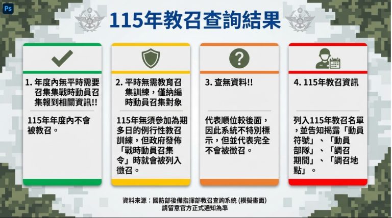 查詢結果通常會出現「年度內無平時需要召集訓練集戰時動員召集報到相關資訊!!」、「平時無需教育召集訓練,僅納編戰時動員召集對象」、「查無資料」及「115年教召資訊」四種,說明如下: