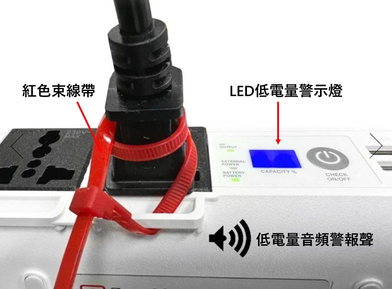 另外,Transport系列電池隨機附贈10條可重複使用的束線帶(紅色)可預防電源線不慎脫落產生斷電風險。透過低電量音頻警報聲、低電量LED警示燈與電源線束線帶三重防護,確保電池保持安全電量狀況!