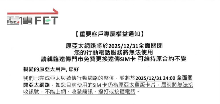 遠傳電信近期全面通知原亞太用戶:「【重要權益通知】原亞太網路即將全面關閉,如您使用的SIM卡仍為原亞太舊版卡片,2025/12/31後您的行動電話服務將無法使用,例如不能上網、收發簡訊或撥接電話等。請盡速攜帶本人雙證件至遠傳門市更換新卡(維持原合約不變),以確保您的使用權益。」換言之,遠傳電信計畫將在2025/12/31全面汰除原亞太電信基地台,