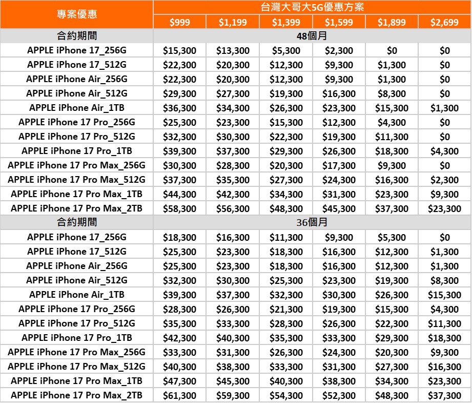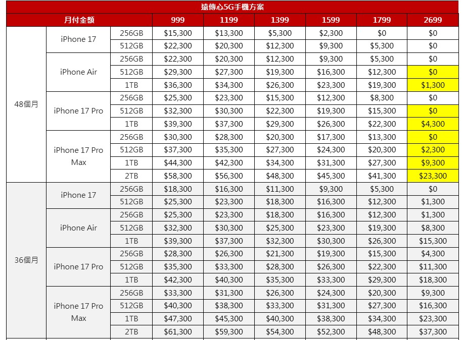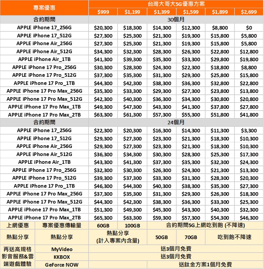 a. iPhone17系列新機優惠資費方案: