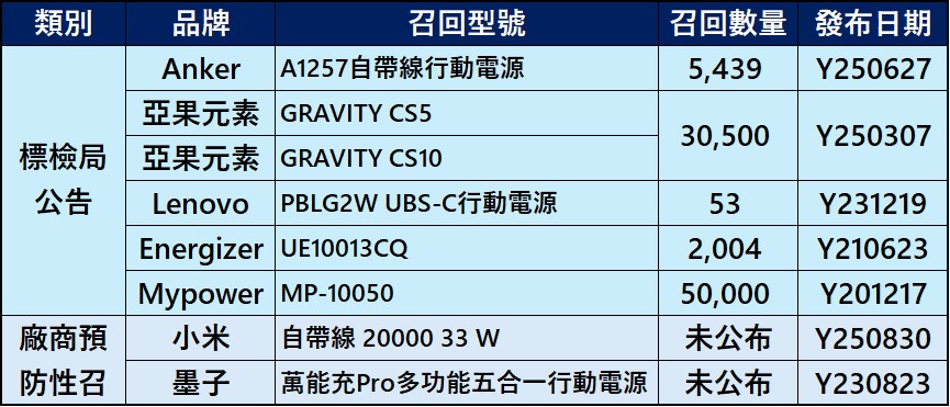 因應近期行動電源在大眾運輸工具發生無故起火燃燒事件,經濟部標檢局公布最新需召回的行動電源型號清單,包括展碁Anker A1257自帶線行動電源(5439顆)、亞果元素GRAVITY CS5/CS10( 3萬500顆)、聯想Lenovo PBLG2W( 53顆)、Energizer UE10013CQ( 2004顆)、Mypower MP-10050( 5萬顆),共計8萬7996顆。除此也有廠商自主預防性召回部分期間的指定行動電源包含小米自帶線行動電源20000 33W(型號PB2030MI)及墨子萬能充Pro多功能五合一行動電源。這些召回方案,除今年發布案例,都因時間久遠已經結案。