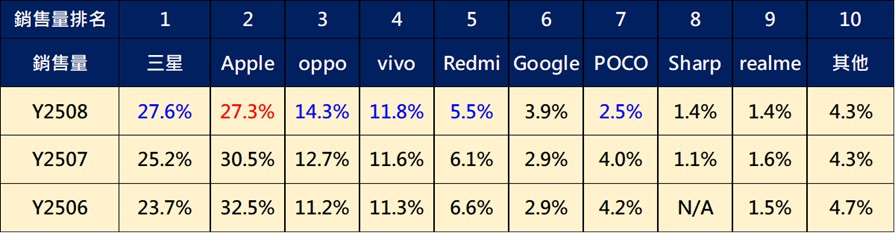 根據GFK的統計資料,台灣2025年8月整體手機(不含手機原廠官網銷售) 為36.1萬台,較上月下滑9.07%,較去年同期仍成長2.27%,八月整體手機銷售下滑乃受 iPhone 17新機將於9月上市造成。