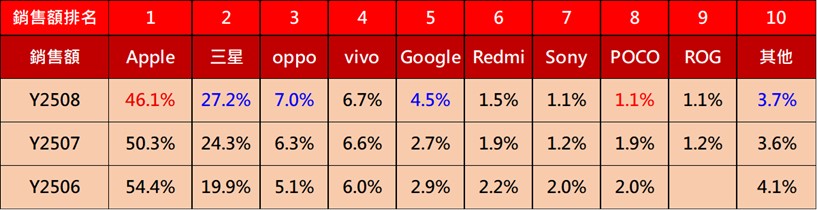 在品牌銷售額部分,Apple仍以46.1%維持在第一名的寶座,三星則以27.2%穩居第二,oppo則以7%重回第三名贏過6.7%的vivo,Google、紅米、SONY、POCO、ROG、小米分居第5~第10名。