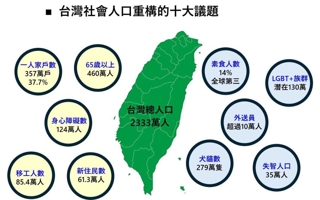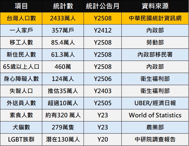 日前版主在臉書與Threads分享過去自己在過去就職公司內部研究未來台灣市場商機報告中的台灣社會重構圖,引起不少網友共鳴,也有人敲碗引述資料來源。版主因工作屬性關係歸納出台灣十大社會重構項目,包含一人家戶數、65歲以上人口、移工人數、新住民人數、身心障礙人數、失智人口數、素食人口數、外送員人數、犬貓數 、LGBT族群,衍生出單身經濟、銀髮照護、外籍人口經濟、毛小孩經濟、懶人及宅經濟、素食經濟、彩虹經濟..等等。 引述統計資料大都透過上網蒐集各方政府統計與新聞資料,以下整體最新的統計數據與資料來源: