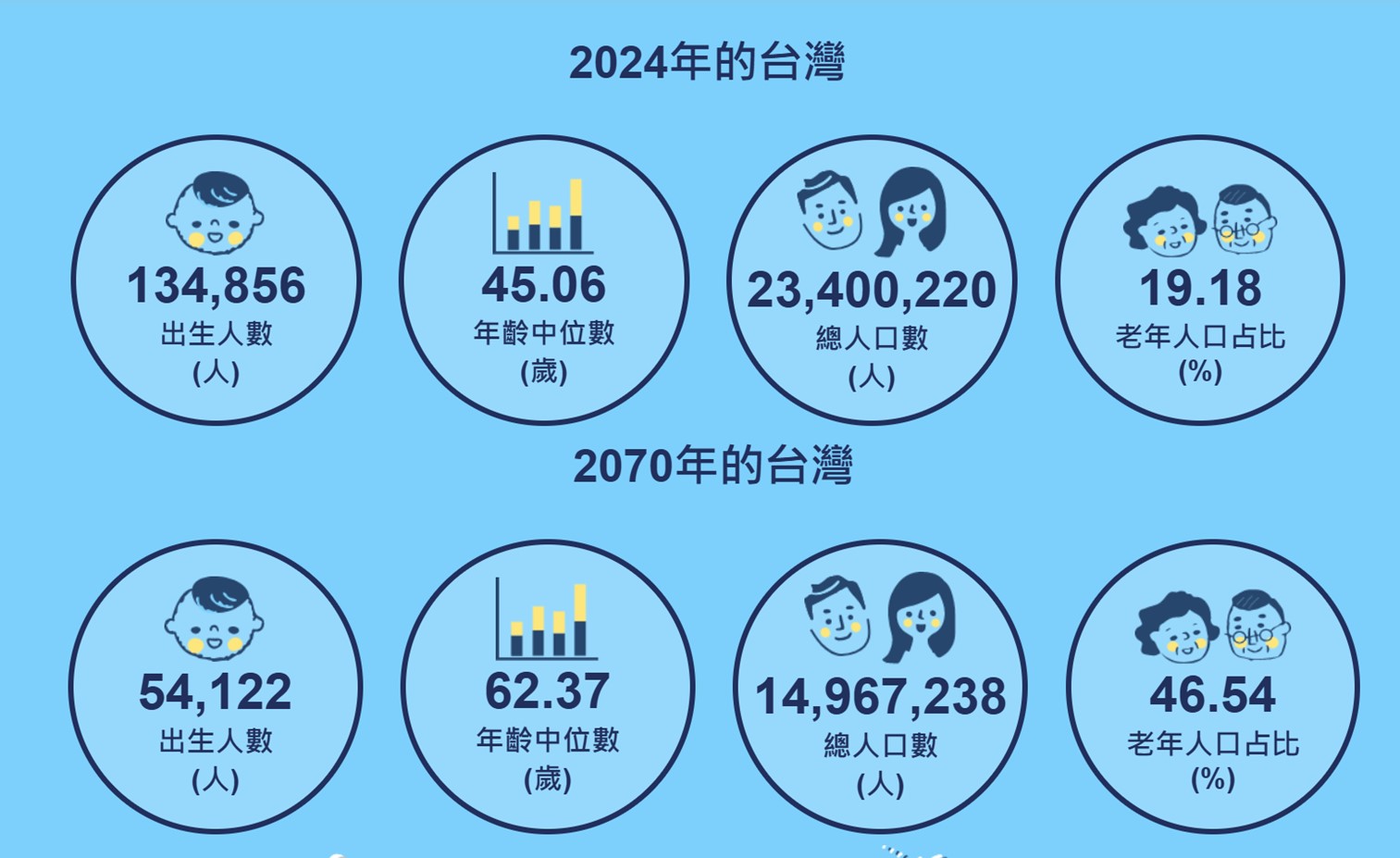 根據國發會公布「中華民國人口推估(2024年至2070年)」,台灣將於2025年正式進入超高齡社會,2030年總人口開始低於2300萬人、年齡中位數為48.7歲;到了2070年,台灣總人口數將降至低於1500萬、年齡中位數為62.37歲,65歲以上老年人口占比為46.54%。由於少子化、高齡化、人口減少三大不可逆趨勢,將台灣經濟、產業、政府財政收入與社福醫療支出出現重大挑戰,以台灣內需為主的企業與商家也必須提早因應,化危機為轉機!