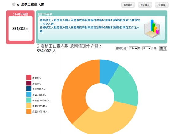 勞動部統計,截至2025年8月底,全台引進移工人數已達85萬4,002人。