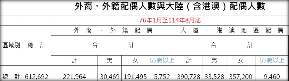 內政部移民署2025年8月公告新住民人口(包括婚姻移民、專業技術移民、陸港澳居民及新住民子女)總人數為612,692人。其中,中國港澳配偶為39.1萬,其他外裔及外籍配偶為22.2萬。新住民配偶的增加為台灣注入多元文化,也成為穩定社會勞動力與家庭結構的重要力量,不過新住民也面臨融入台灣社會、教育等方面的挑戰,其中陸配更引起諸多政治性討論。