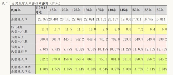 衛生福利部委託國家衛生研究院進行「全國社區失智症流行病學調查」,全國社區65歲以上長者失智症盛行率調查結果為7.99%,推估2024年65歲以上失智症人口數約35萬人、2031年將逾47萬人、2041年65歲以上失智症人口數近68萬人,有逐年攀升趨勢。