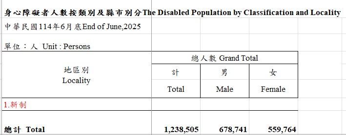 衛生福利部2025年6月統計,台灣身心障礙人口為1,238,505人。