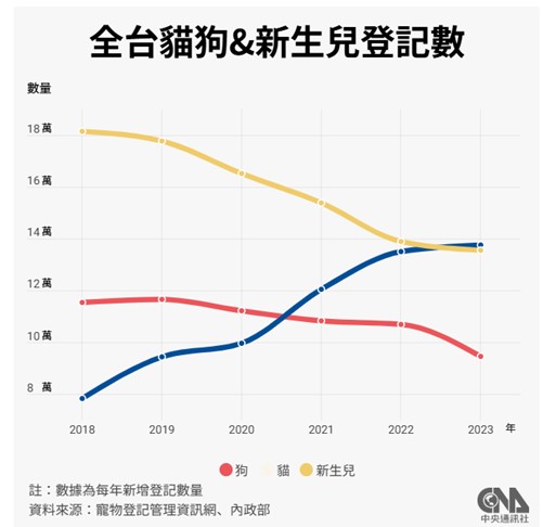 根據農業部的調查,截至2023年,台灣家犬數量約為1,480,637隻,家貓數量則約為1,311,449隻。 相比2021年,家犬數量增加了19%,而家貓數量則大幅增長了50%,顯示出飼養寵物的家庭比例上升的趨勢。2023年數據顯示,台灣全年累計犬隻登記9萬4544隻,貓兒13萬7652隻,合計23萬2196隻,遠高於同年新生兒13萬5571人,多出近10萬。