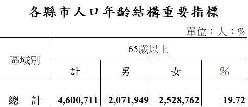 根據內政部2025年8月的統計數據,台灣65歲以上老年人口約為460萬771人,占總人口的19.72%。