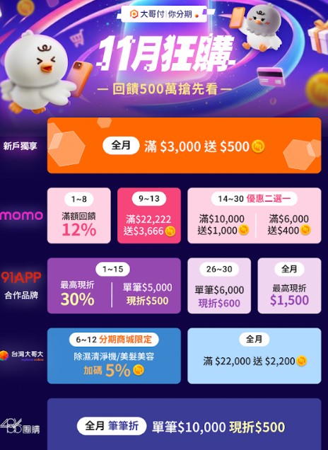 b.11月1日至11月11日再推出第二波「玩樂狂Buy」活動,單筆滿1111元再贈Hami Point 50點;中華電信會員再享專屬優惠券,包含雄獅旅遊、