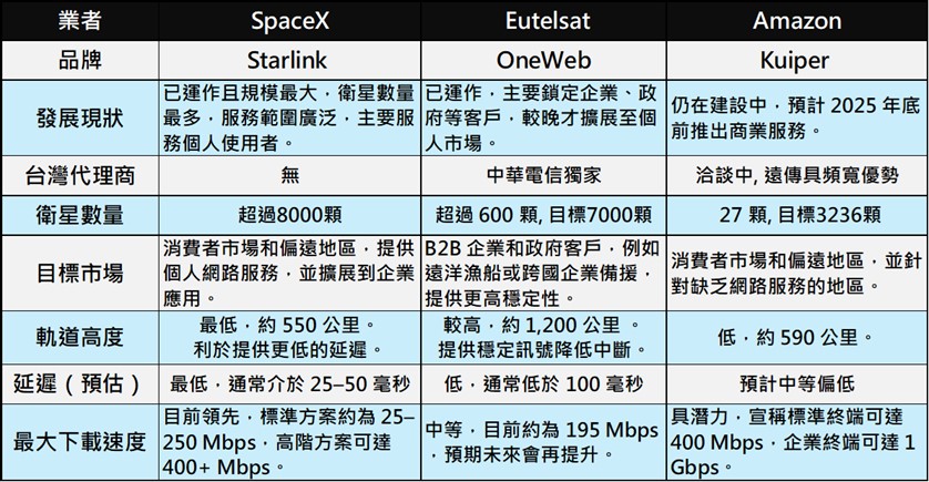 Starlink是目前低軌衛星數量最多且服務範圍廣泛的業者,已發射超過8000顆衛星,目標客群是個人消費市場與偏遠地區,其軌道高度只有550公里可以提供較低的延遲,目前提供的網速為25Mbps~400+Mbps;OneWeb目前已發射600顆衛星,目標客群是B2B企業及政府單位,其軌道高度為1200公里可以提供較穩定的訊號但延遲時間較長,目前提供的網速為200Mbps;Kulper則仍在積極建設中,最快2025年年底才會開始營運,目標客群與Starlink雷同鎖定個人消費者與偏遠地區,其軌道高度為590公里,延遲時間與訊號穩定性介於Starlink與OneWeb之間,宣稱將提供400Mbps~1Gbps的網速。