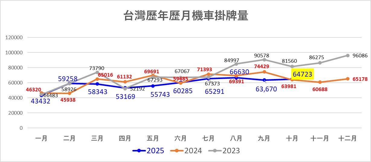 2025年10月份台灣機車總掛牌數64,723 輛,在各品牌針對國民機車利用政府貨物稅補助進行促銷加碼及Yamaha七代勁戰125與PGO isavR威力125新車持續交車下,較上月小幅成長1.7%,較去年同期成長1.2%,呈現雙指標都成長樣態。