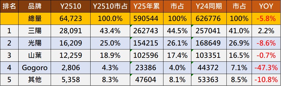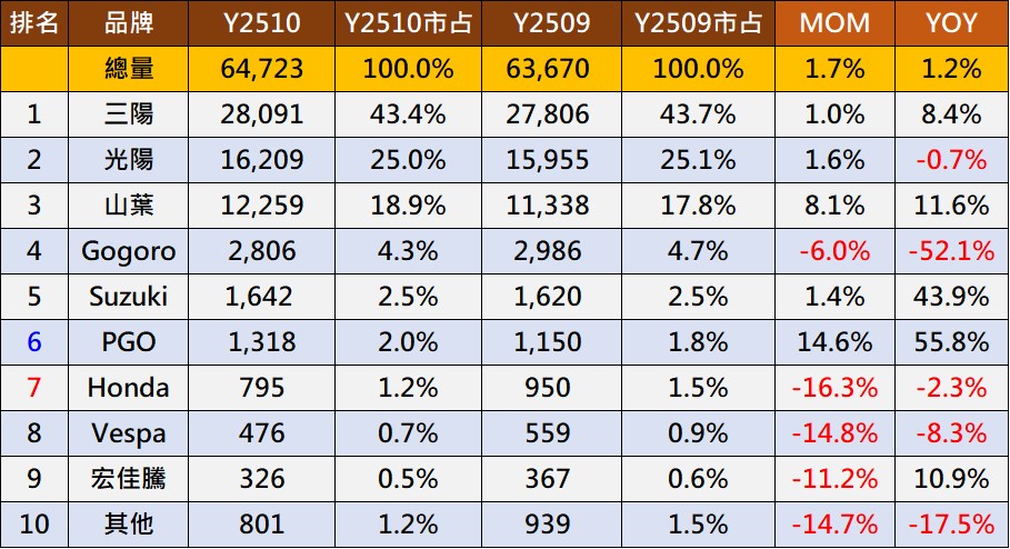 三陽機車與光陽機車10月份各以掛牌28,091輛(市佔43.4%)與16,209輛(市佔25.0%)穩居前兩名,山葉機車受惠新車「勁戰七代125」與「CUXiE」新車持續交車,佔比拉升到18.9%;Gogoro 、Suzuki、PGO 各以掛牌2,806輛(市佔4.3%)、1,642輛(市佔2.5%)與1,318(市佔2.0%)位居3、4、5名,其中gogoro受到政府補助燃油車貨物稅讓銷售略為低迷,PGO則在油電機車isavR 125掛牌數636輛下仍小幅成長穩坐第六名。