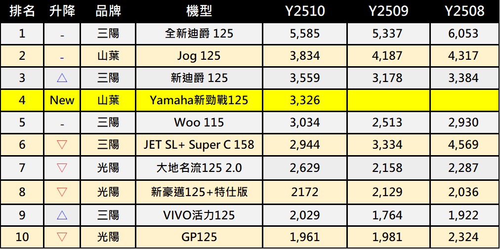 2025年10月機車掛牌量出爐,在各品牌祭出政府貨物稅補助進行促銷加碼下,10月份整體機車總掛牌數為64,723 輛,較上月成長1.7%,其中山葉在「勁戰七代」新車上市影響持續拉高至18.9%。