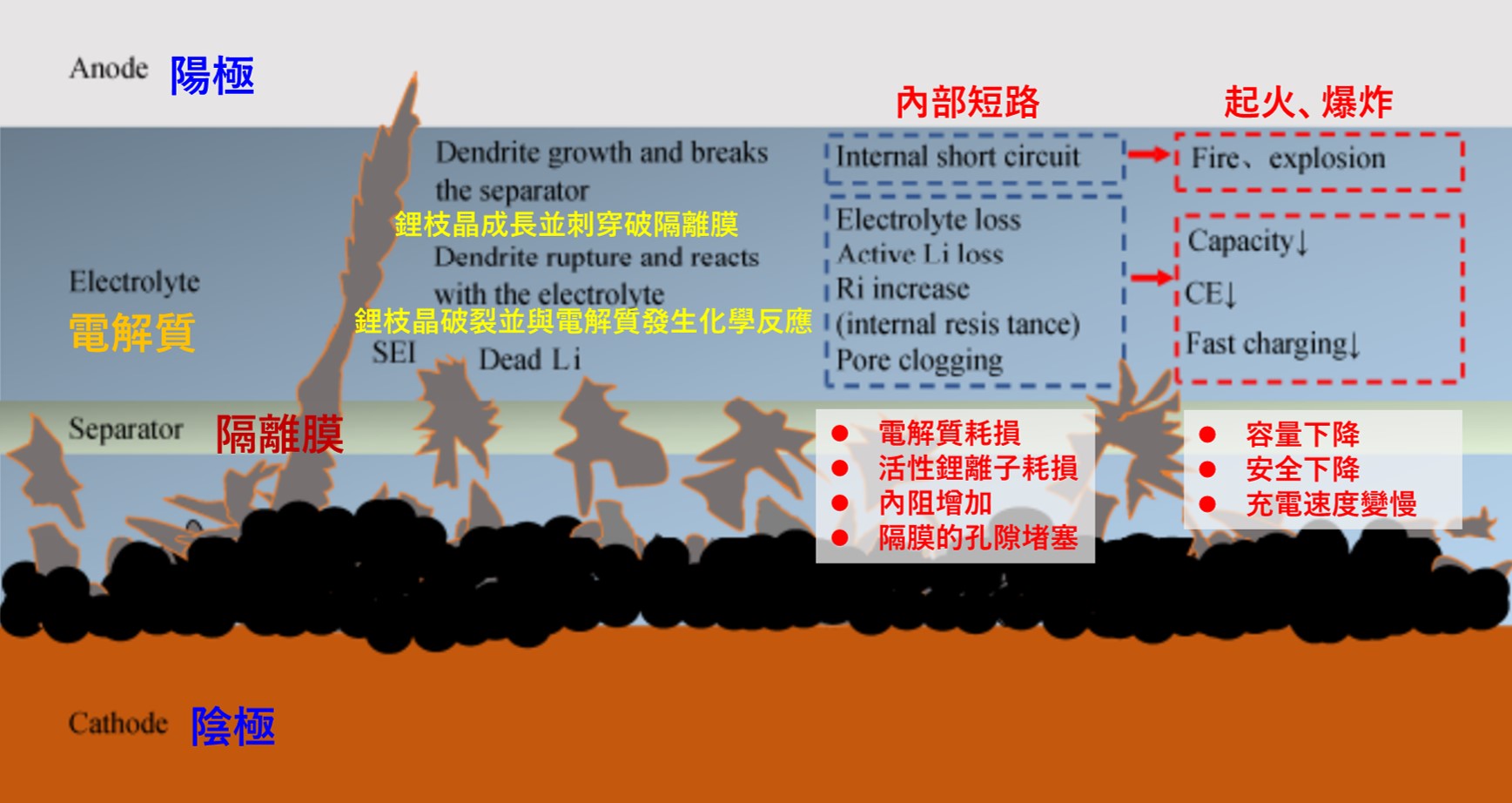 由於一般液態鋰離子電池會因使用或是存放而老化,電池內部的隔離膜(分隔正負極的材料)會變薄或受損。近期出現的鋰電池自燃起火事件主要都是歸因出包的電池蕊使用一段時間後內部形成鋰枝晶(Dendrites)或金屬微粒並刺穿已變薄或受損隔離膜,導致內部短路,進而引發熱失控而起火自燃。