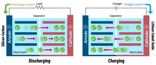 高容量矽碳鋰電池最大優勢是相同體積可以提供更大電池容量及支援更大電力充電,但最大缺點是矽材料會膨脹約 300%,放電時則收縮,這種反覆的體積變化容易造成矽顆粒破裂、粉化,導致循環性能較差,電池壽命較短。