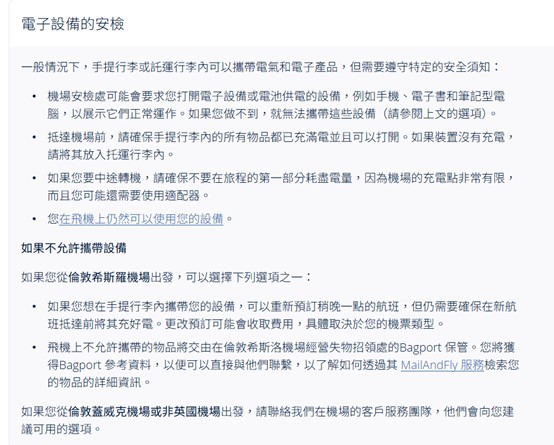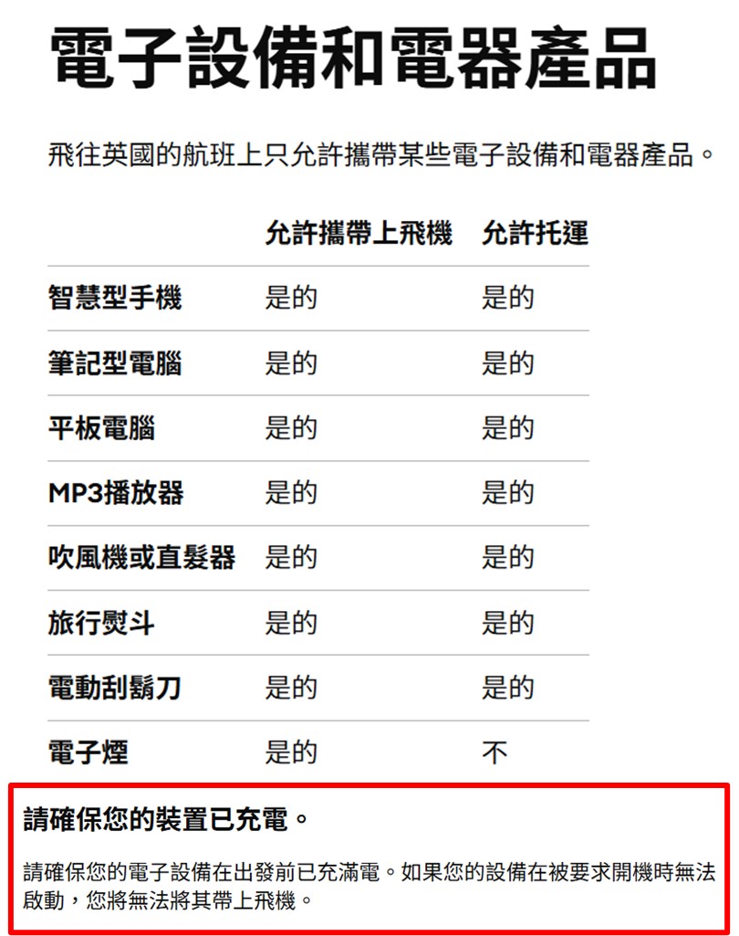 根據英國航空(British Airways)說明,禁止電力不足的電子產品隨身攜帶登機,主要是基於登機安全檢查需要。若裝置電量偏低導致檢查時若無法啟動裝置,安檢人員可能將其視為安全風險並予以沒收。若旅客電力不足的手機、平板、電子書、筆記型電腦..等電子裝備(行動電源除外),建議可提前放入托運行李,避免轉機途中耗盡電力。