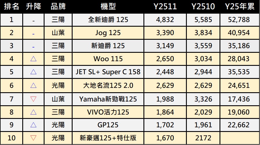 2025年11月份台灣機車熱銷榜為何呢? 以下作一整理與說明: