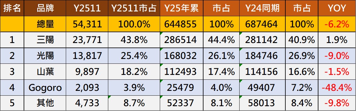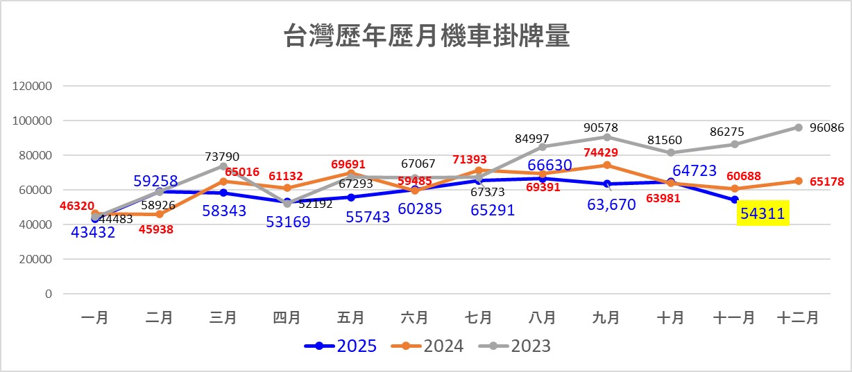 2025年11月份是傳統機車掛牌的銷售淡月,台灣機車總掛牌數只有54,311 輛,較上月大幅衰退16.1%,較去年同期衰退10.5%,呈現雙指標都下滑的樣態。
