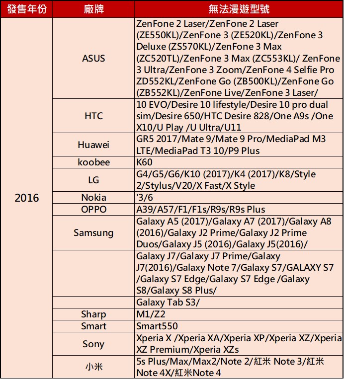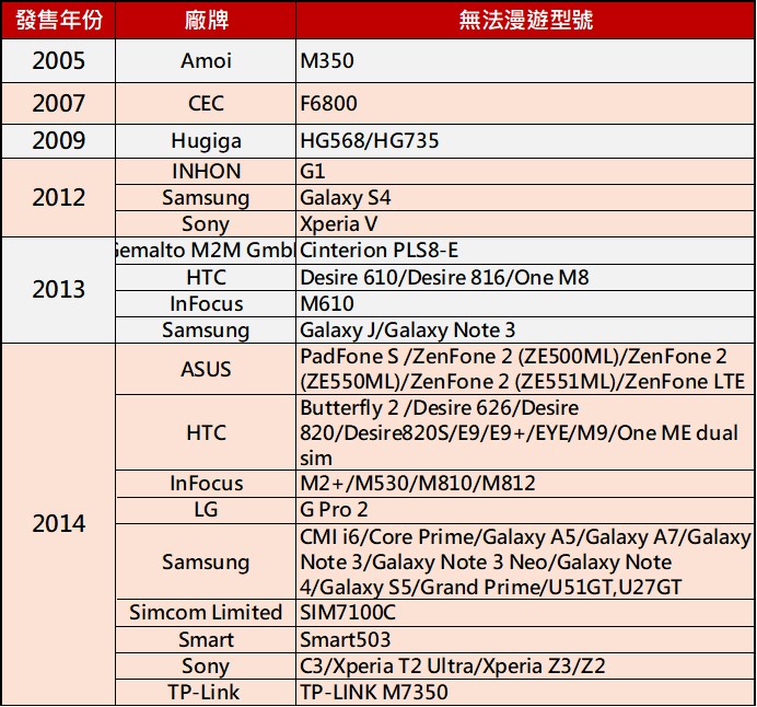 特別提醒,根據遠傳官網公告,若是仍使用2015年以前發售之以下指定手機,因手機過於老舊無法支援漫遊遠傳基地台功能,原亞太用戶必須更換手機或是盡速換成遠傳卡,才能恢復正常收訊。