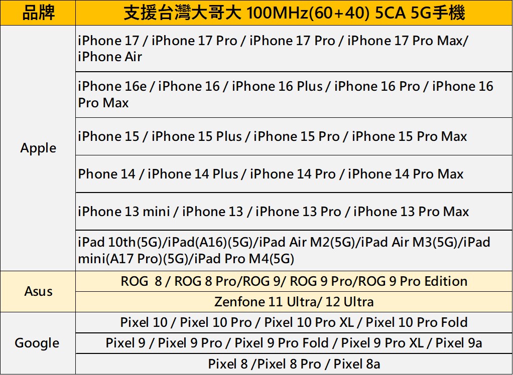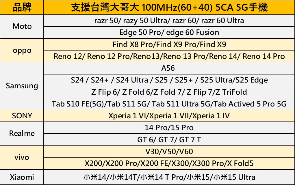根據版主的資料,目前台灣坊間市售的5G手機有98款機型支援台灣大哥大5G 2CA功能,包含Apple iPhone 13系列(含)以後機款及iPad 10代以後、ASUS ROG 8系列(含)/Zenfone 11 Ultra系列(含)以後、Google Pixel 8系列(含)以後、MOTO Razr 50系列(含)及edge 50(含)以後、oppo Find 80 Pro(含)及Reno 12系列(含)以後、三星A56/S24系列(含)/Z折疊6系列(含)以後 、SONY Xperia 1 VI(含)以後、Realme 14 Pro(含)及GT6(含)以後、VIVO V30/V50及X200系列(含)以後、小米14系列(含)以後..等等。