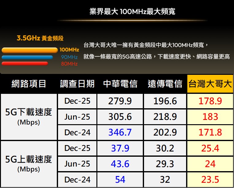 日前Opensignal公布「2025年下半年台灣行動網路品質體驗」,其中台灣大哥大雖宣稱然持有100MHz 5G最大黃金頻寬、實測可以飆破1Gbps以上,但最新測試報告的5G下載網速仍是敬陪末座,讓一些台灣大哥大用戶大感失望,更有網友大酸:「買5G的價格,4G的速度!」。