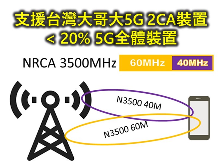 A.台灣大哥大持有5G 3.5GHz頻段不是連續頻,目前僅不到2成裝置支援台灣大哥大5G 2CA功能: