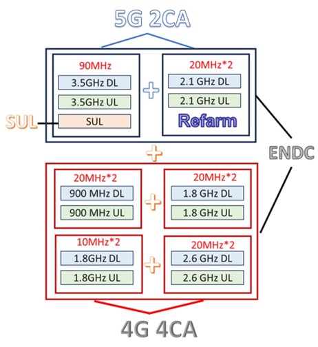 為提高行動用戶更高極速上網,中華電信於2023/10就宣布現有4G與5G頻譜透過頻譜重耕(Refarm)並結合既有的載波聚合技術(CA)及雙連結(ENDC)技術建置出【5G 2CA + 4G 4CA】的最大頻譜運用(詳見”這篇”)。運用90MHz的3.5GHz與重耕(Refarm) 成5G 頻段的2.1GHz、再結合900 MHz、1800MHz、2600MHz的4G頻譜,於熱門商圈導入【5G 2CA + 4G 4CA】提供行動下載速率理論峰值超過2 Gbps,相較先前行動峰值網速再提升10%以上。