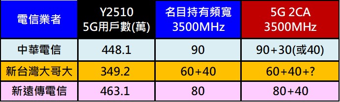 台灣大哥大目前持有的5G 3.5GHz頻段剛好是3.5GHz頭尾兩段頻段40MHz + 60MHz頻寬,若5G用戶持有的手機不支援台灣大哥大n78+n78 5G 2CA功能,實際使用的最大頻寬只有60MHz,是不如中華電信90MHz與遠傳電信80MHz連續頻。