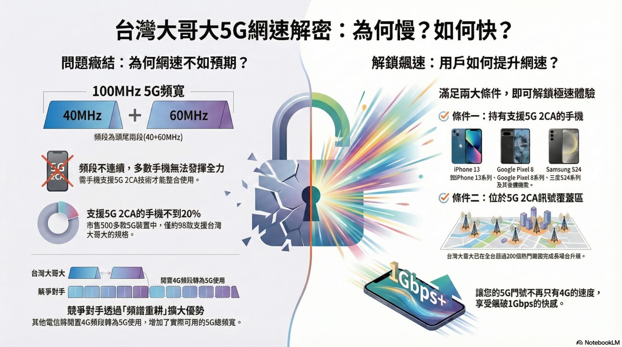 台灣大哥大雖宣持有5G最大100MHz 黃金頻寬,但國際業者最新5G測速報告卻敬陪末座居,出現頻寬最大卻網速最慢的窘境。以下是解開台灣大哥大5G網速之謎與用戶如何解封網速限制方式的摘要影片與詳細說明: