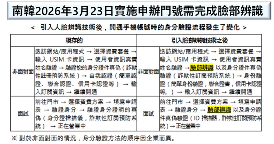 防範網路詐騙或簡訊釣魚行為,南韓科學技術資訊通信部日前宣布自2026年3月23日正式實施開通手機門號需完成臉部辨識強化身分驗證。南韓申辦電信門號必須留存用戶現場人像照片措施(臉部辨識)並非創舉,台灣自2023年9月起就已陸續施行迄今。