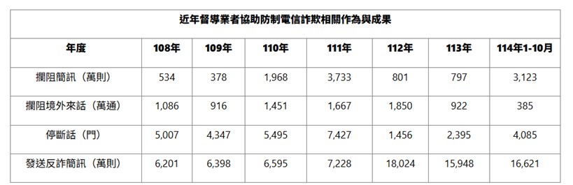 根據NCC的資料,截至114 年10 月31 日,已拒絕高風險用戶、非本國籍人士、企業客戶約24.4萬門號,並主動停話非本國籍人士38.1萬門號。詳細執行成效如下:
