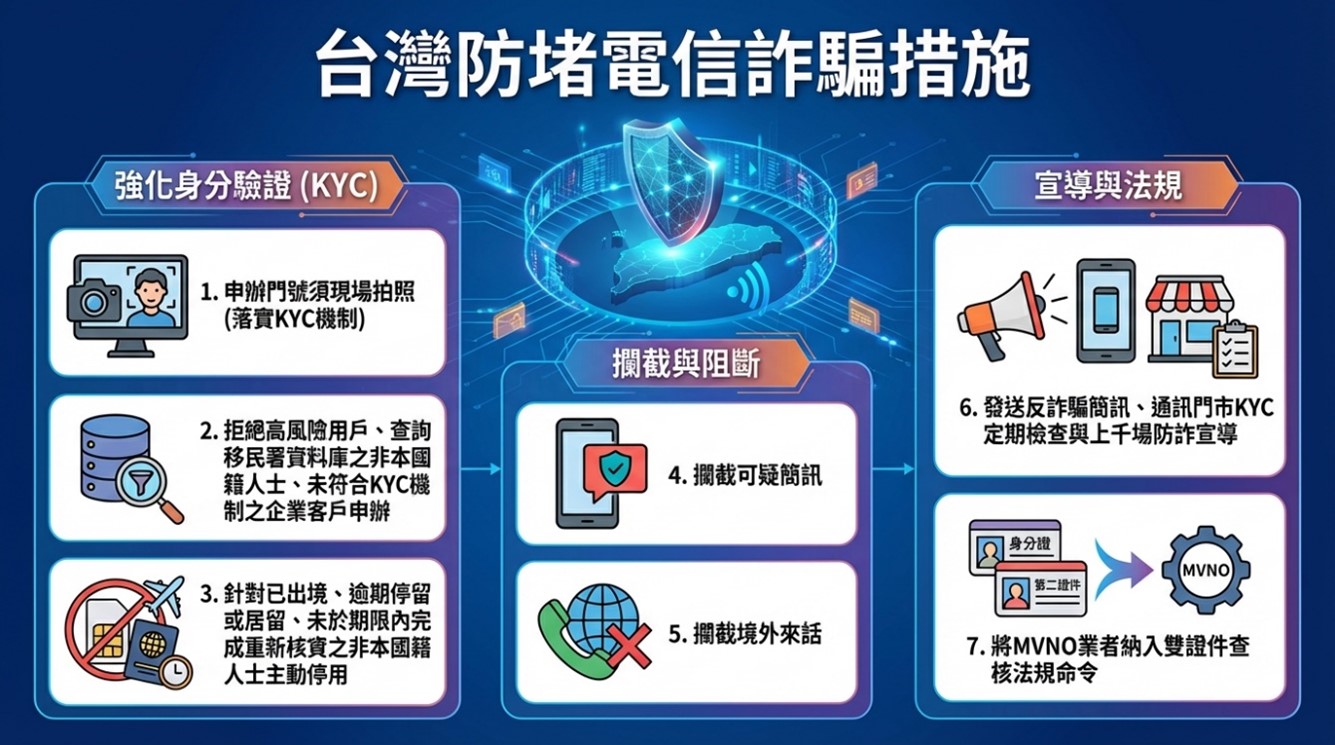 根據台灣過往的經驗,電信詐騙最大的漏洞來自詐騙集團假借企業用戶名義大量申辦門號以及外籍移工或觀光客申辦預付卡所致,所以NCC配合113 年7 月31 日公布施行的「詐欺犯罪危害防制條例」於 113 年4 月1 日、113 年9 月11 日及114 年9 月26 日修正「電信事業提供電信服務風險管理機制指引(KYC 指引)」,指導電信事業強化身分查核之風險管控措施,增加對自然人用戶申辦行動門號數量之管控,以及於一定期間內換號次數之限制,逾管控上限者應說明使用目的並提出相關證明資料,進以降低詐騙集團濫用人頭門號從事詐欺犯罪之風險。