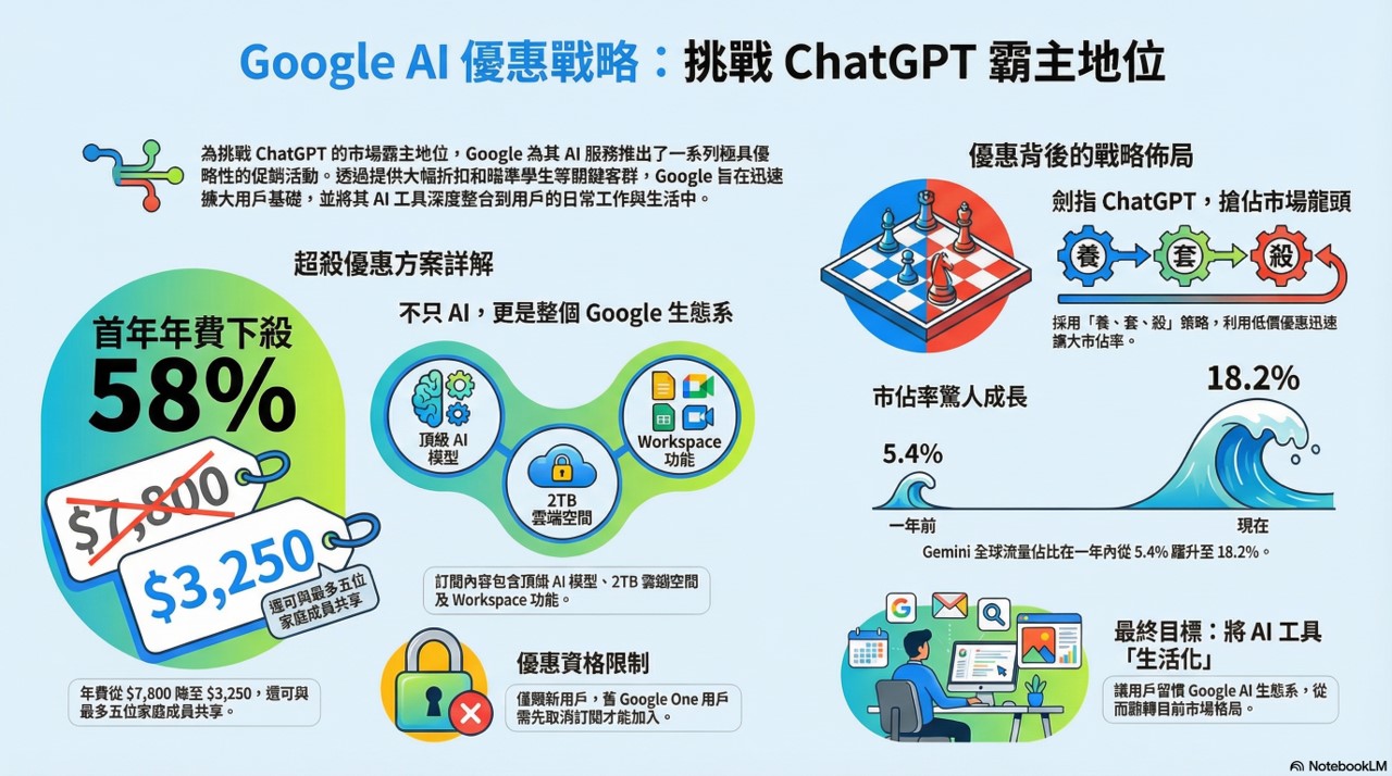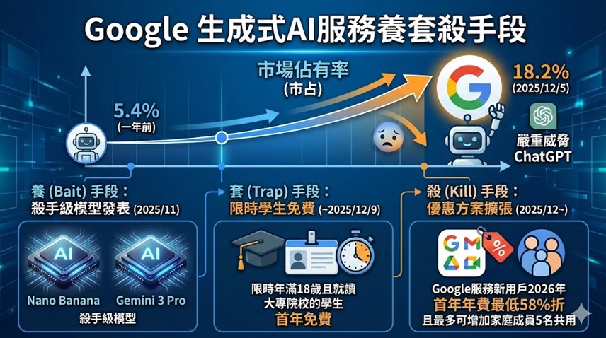 Google自今年8月起不但發表Nano Banana 和Gemini 3 Pro 這兩款殺手級模型,更推出限時年滿18歲且就讀大專院校的學生首年免費方案,近日又祭出Google服務新用戶2026年首年年費最低58%折且最多可增加家庭成員5名共用的優惠方案等轟動武林的大殺招,市占率也大幅提升嚴重威脅ChatGPT霸主地位。
