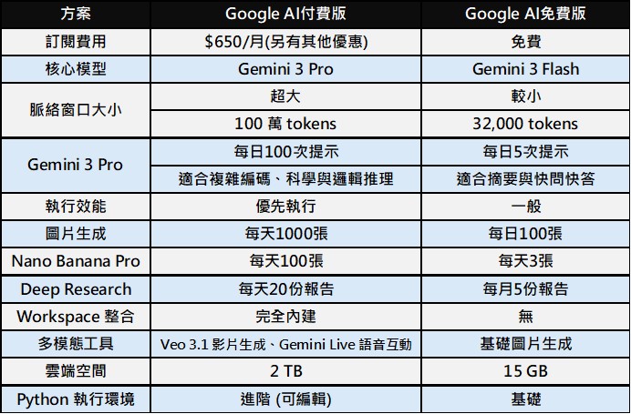 ▲ Google AI付費版與免費版服務差異