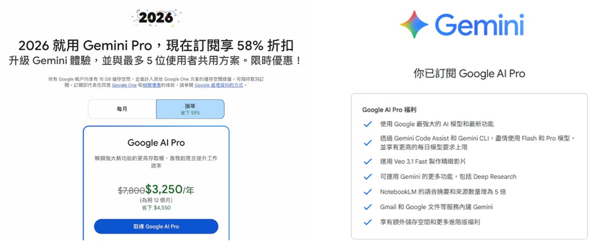 2026年首年年費最低58%折優惠方案內容為何? 無法訂閱Google AI Pro 2026優惠方案該怎麼辦? Google為何推出超殺訂閱Google 生成式AI服務優惠方案?以下做一說明: