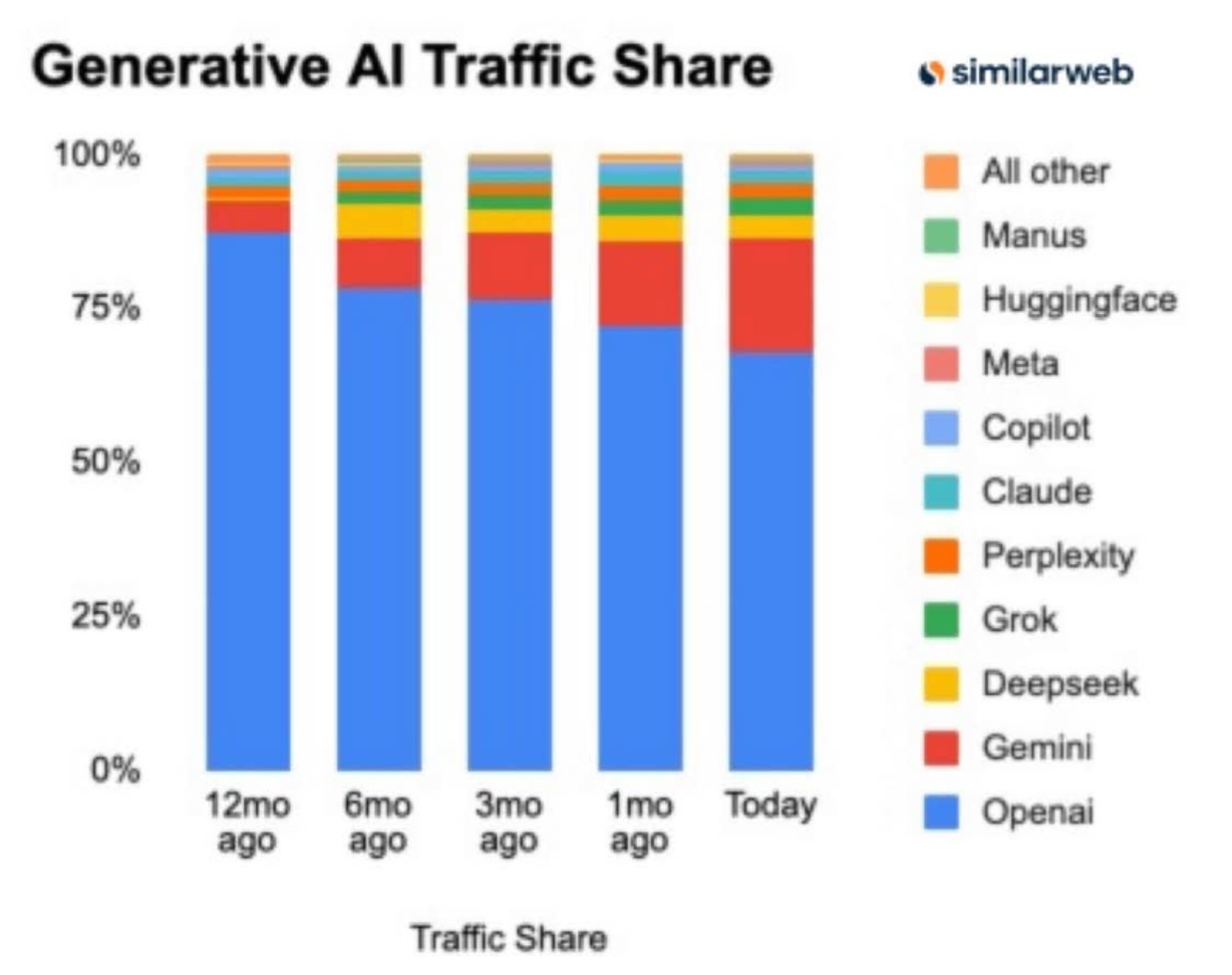 為了搶下「ChatGPT 」霸主地位,Googel 自2025年8月發表爆紅的Nano Banana殺手級模型,今年9 月底,Gemini 應用生成圖像就突破 50 億張,月活躍用戶從 3.5 億飆升至 6.5 億,並登上 App Store 下載榜首,超越 ChatGPT。Google AI 服務就開始起飛市占突破10%,11月推出另一個殺手級模型~Gemini 3 Pro,讓外界叫好又叫座,讓市占持續上揚。