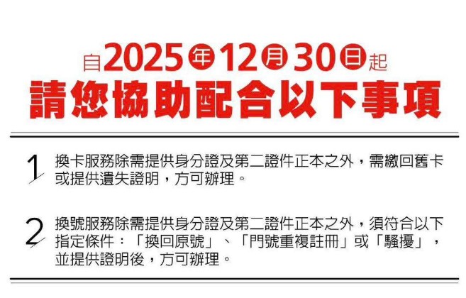 中華電信與遠傳電信陸續公告;為配合政府主管機關打詐策略,自2025年12月30日起,用戶申請換補卡或換號服務,須配合以下事項: