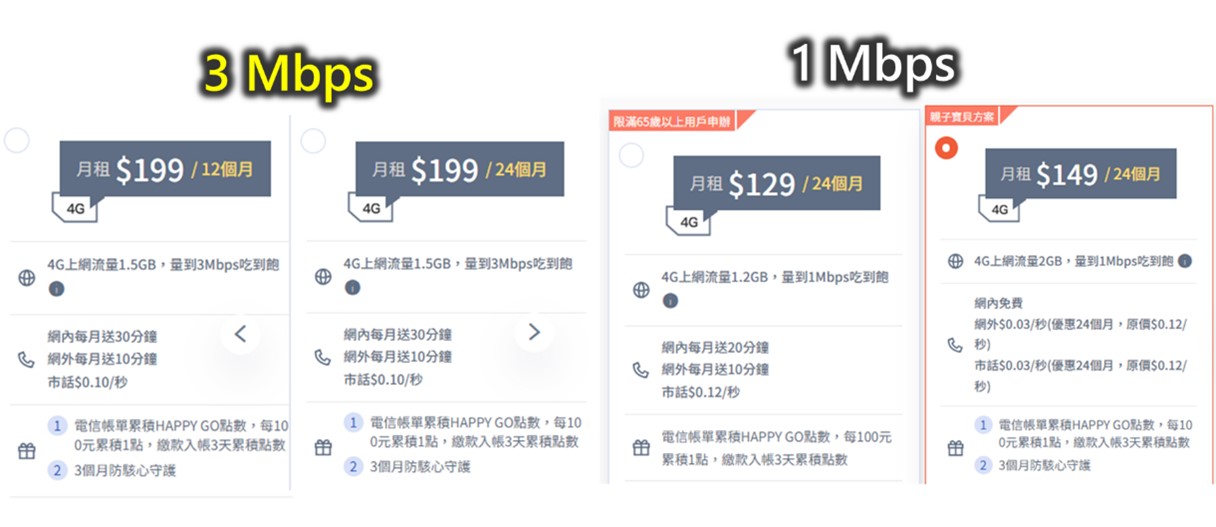 超量1Mbps方案中,4G 129樂齡方案須年滿65歲才能申辦,每月免費1.2GB上網流量,需綁約24個月;親子寶貝149則無資格限制,綁約12個月與24個月搭送的免費語音分鐘或費率不一樣!