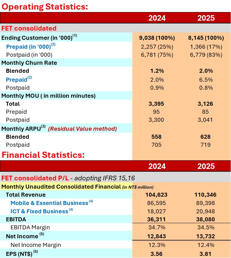 遠傳2025全年度合併總營收達到1,103.46億元,年成長率5.5%;年度合併EBITDA與稅後淨利分別為380.80億元與137.32億元,年成長率分別為4.9%與6.9%;2025年合併總營收、合併EBITDA及EPS3.81億元皆創下歷史新高,全年稅後淨利也是近20年來新高。