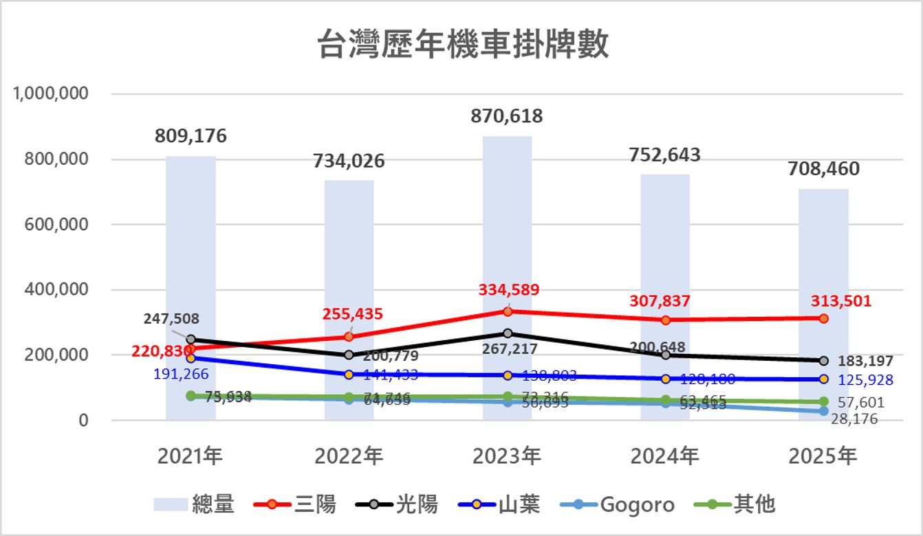 台灣2025年國內機車年度掛牌量出爐,2025年整體機車總掛牌數為707,406 輛,較前年衰退5.9%,三陽仍穩居年度銷售冠軍。2025年雖保住70萬輛門檻,但仍是創下近十年新低紀錄。