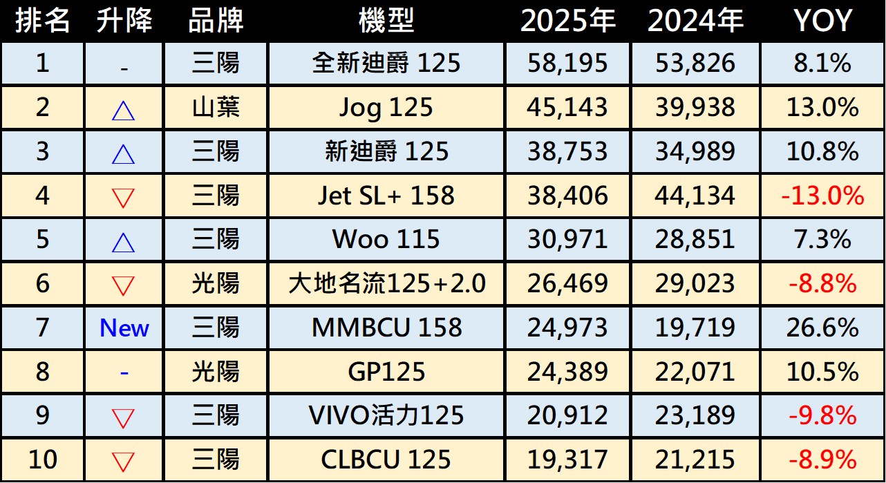 三陽機車2025年TOP10 奪下7款、光陽兩款、山葉一款: