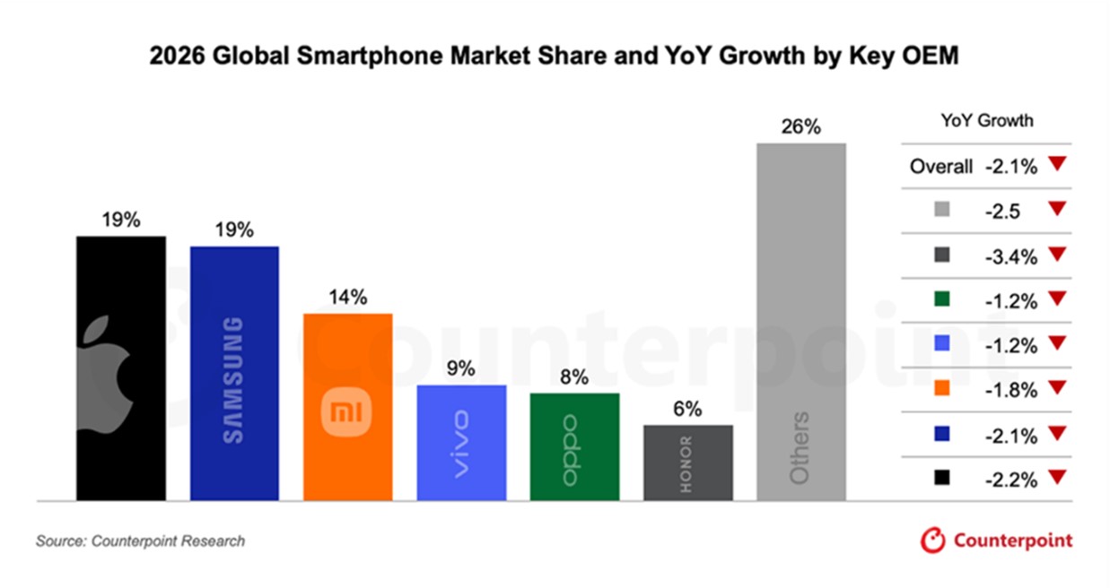 根據 Counterpoint Research 的研究,AI 基礎建設的大規模擴張,導致手機用記憶體價格上漲,尤其Android中低階手機因DRAM與Flash佔成本比重高達30%以上而導致銷量衰退。